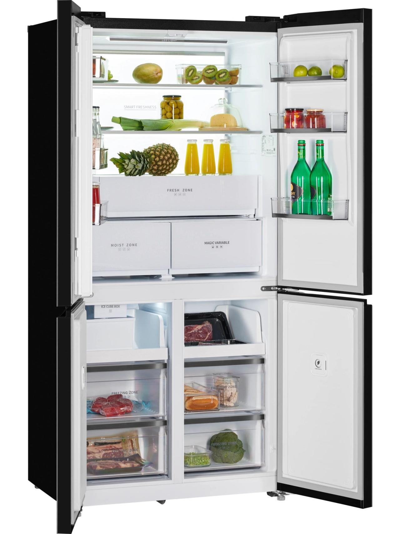 Главное преимущество модели — общий объем 600 л, который позволяет хранить крупные запасы без компромиссов в организации пространства. Двери с открытием на 90° обеспечивают удобный доступ ко всем полкам и ящикам даже при установке рядом с мебелью, а продуманная компоновка помогает быстро находить нужные продукты.