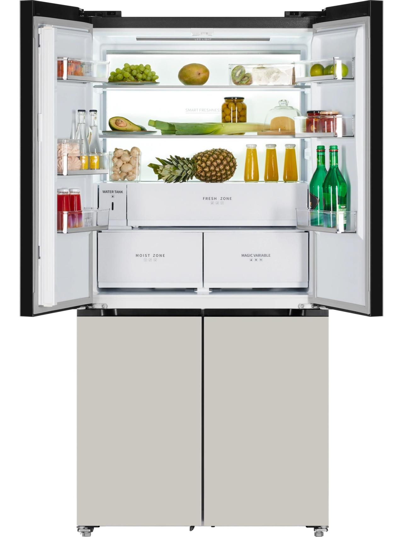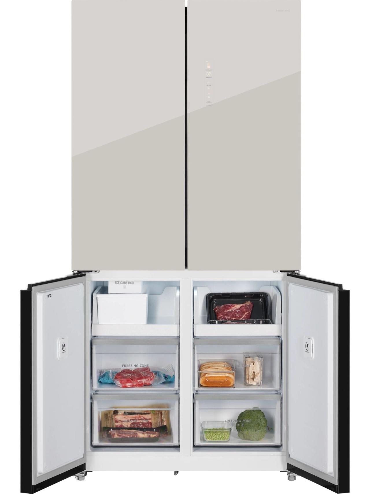 HIBERG i-RFQ 705G Y — это продуманный до мелочей четырехдверный холодильник для тех, кто хочет совместить вместимость и эстетику. При высоте 191 см и глубине всего 60 см он органично вписывается в кухонный гарнитур, сохраняя идеальные пропорции и удобство доступа. Внешний фасад из бежевого стекла с фантомным сенсорным дисплеем подчеркивает минимализм и современный стиль.