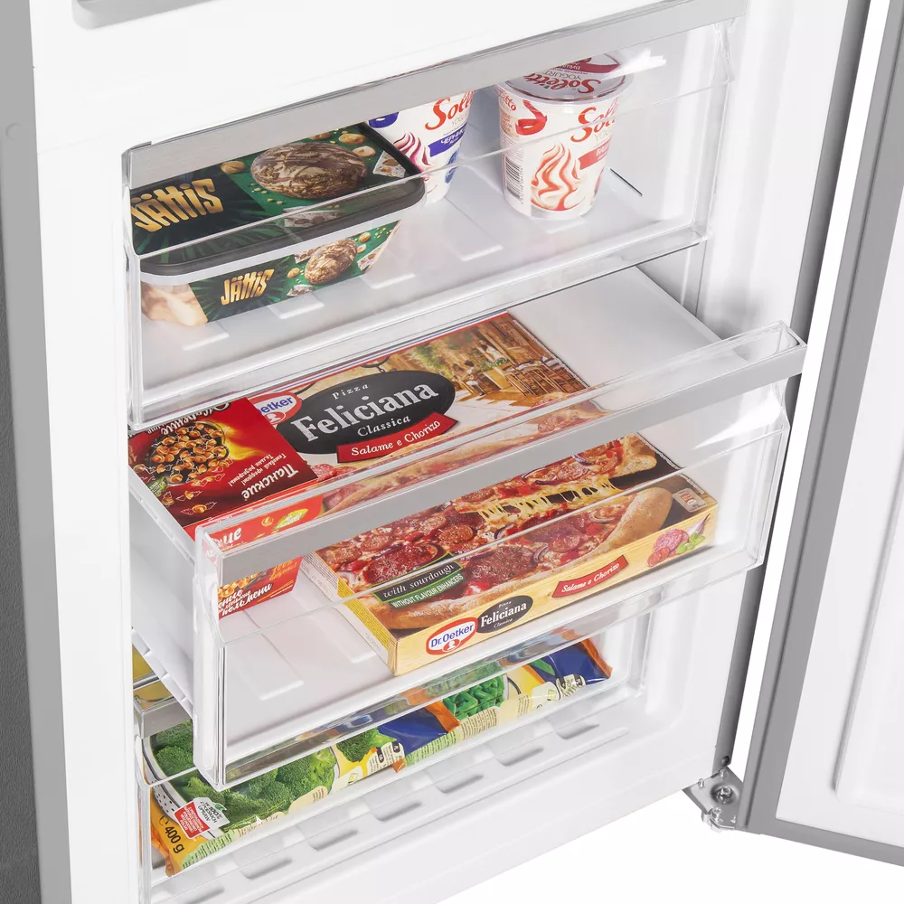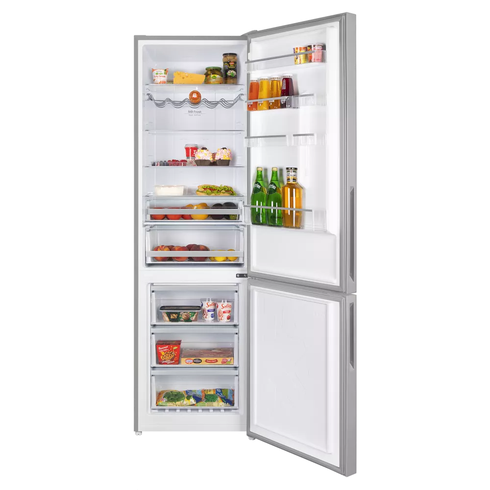 Холодильник NO FROST с инвертором MAUNFELD MFF200NFS Inverter создан для тех, кто ценит стабильную температуру и чистоту внутри камер. Модель сочетает элегантный стеклянный фасад и практичный металлический корпус, а продуманная организация полок и ящиков помогает легко навести порядок и быстро находить продукты.