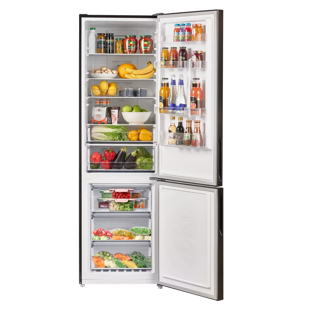 За равномерное распределение холода отвечает динамическое охлаждение: специальный вентилятор поддерживает оптимальные условия на каждой полке и в любом отделении. Внутреннее пространство продумано для гибкой настройки — высота полок и отсеков регулируется, полки выполнены из закаленного стекла, а комплектация включает подставку для яиц и форму для льда.