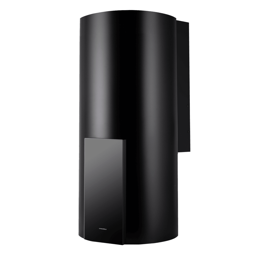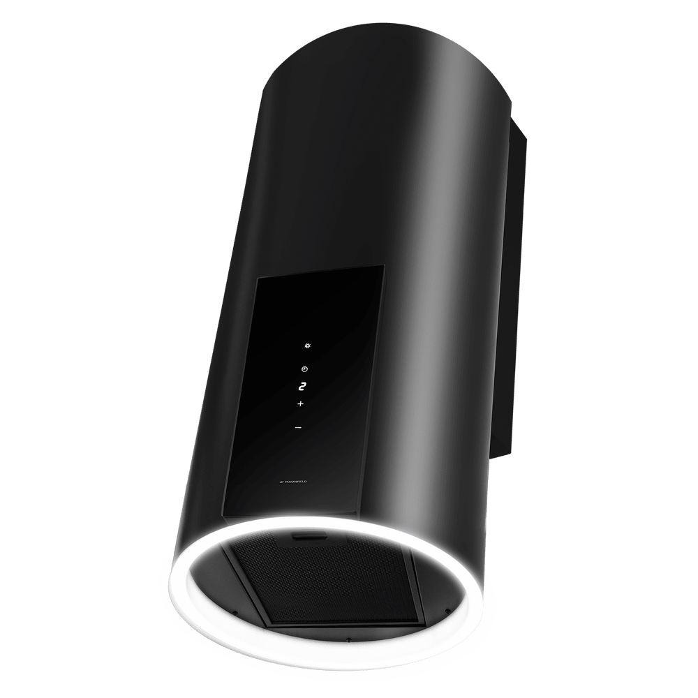 Корпус цилиндрической формы, выполненный из нержавеющей стали с термостойким покрытием, устанавливается на стену над поверхностью плиты. Алюминиевый многослойный жироулавливающий фильтр находится в нижнем торце вытяжки.