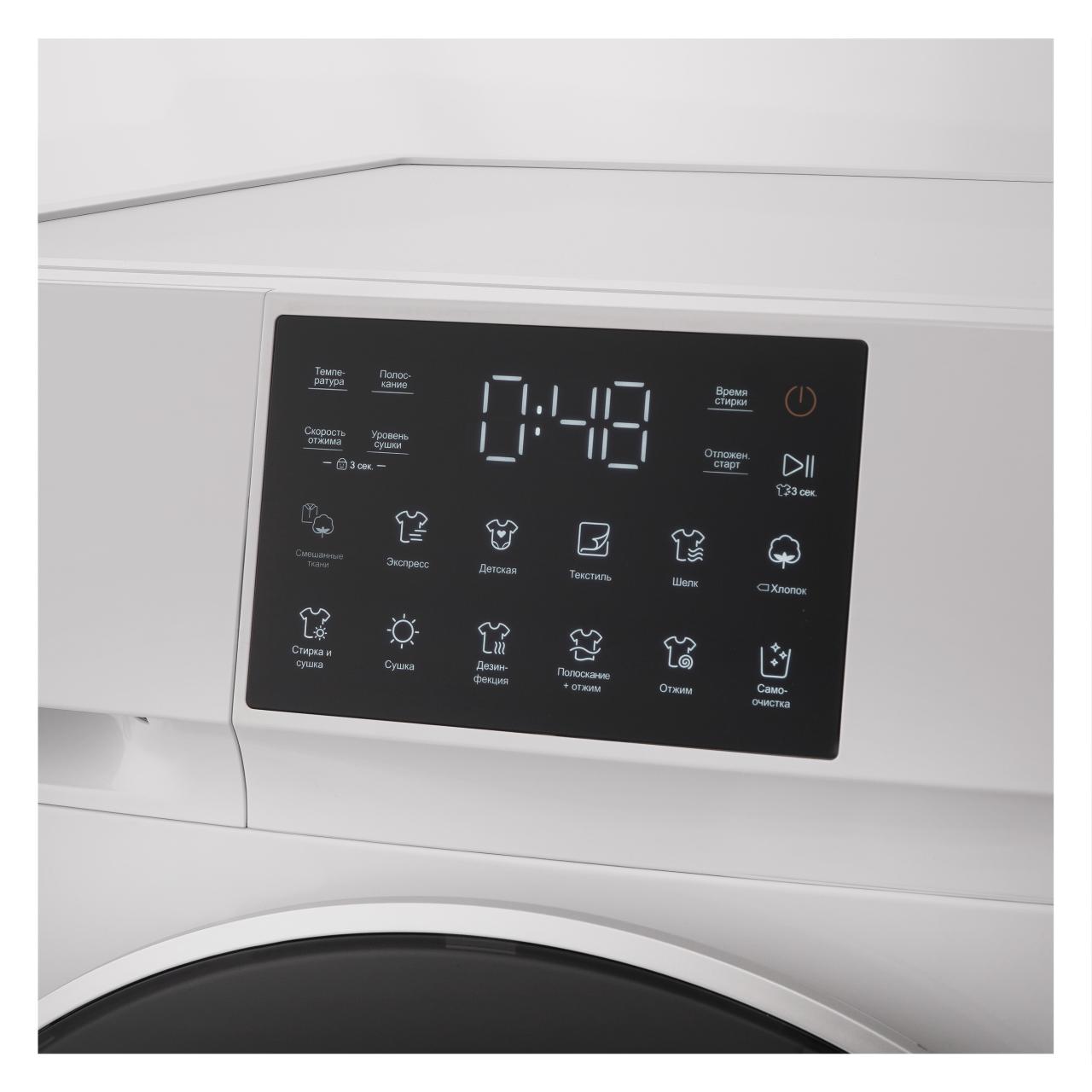 Модель оснащена 12 программами, включая режимы с паром, экспресс-стирку, программы для детской одежды, постельного белья и деликатных тканей. Дополнительно предусмотрена функция стирки с дезинфекцией, а также удобный режим «Стирка + сушка», который экономит время. Сенсорное Full Touch управление обеспечивает лёгкость в использовании, а функция отложенного старта до 24 часов позволяет запускать цикл в удобное время.