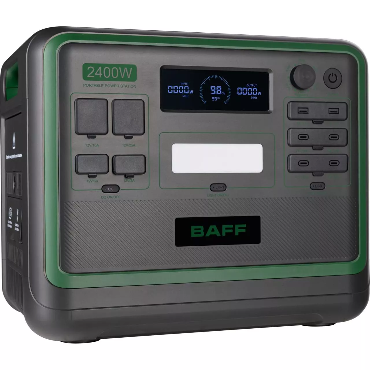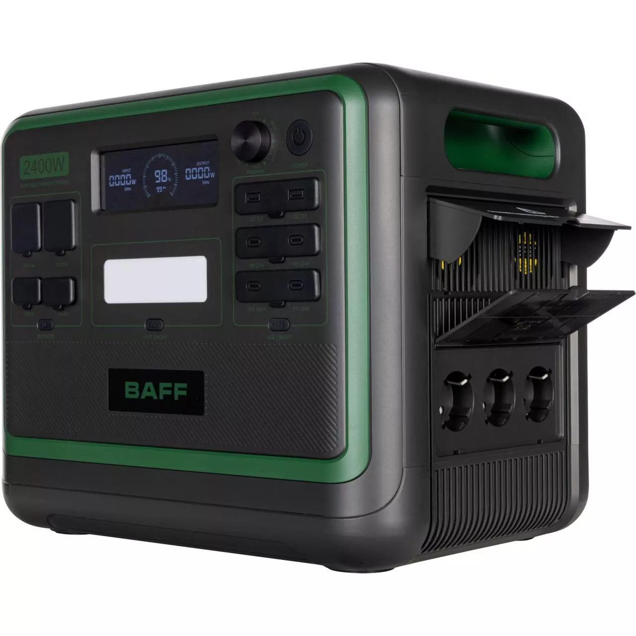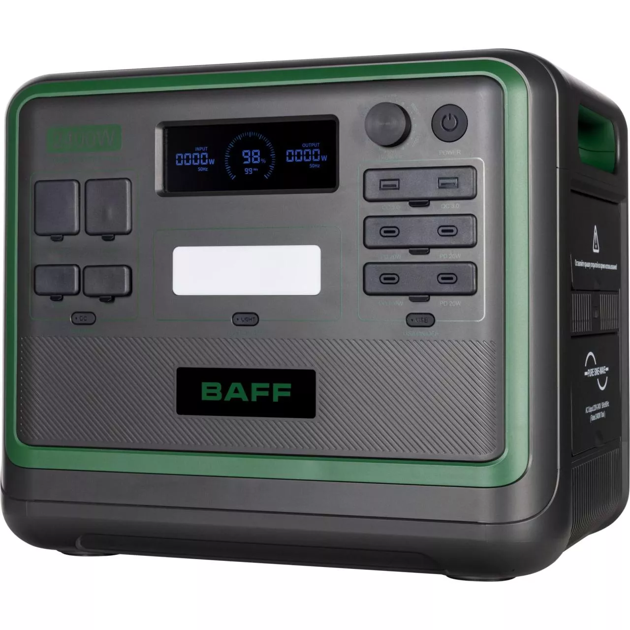 Портативная электростанция BAFF 20.3 емкостью батареи 2048 Вт*ч и мощностью 2400 Вт представляет собой переносное устройство питания со встроенным аккумуляторным блоком и функцией зарядки. Модель станет надежным источником резервного питания в случае кратковременного отключения электричества, незаменимым помощником в поездках, на пикнике на природе. Кроме того, такую электростанцию можно использовать для поддержания бесперебойной работы электроники, бытовой техники и других устройств.