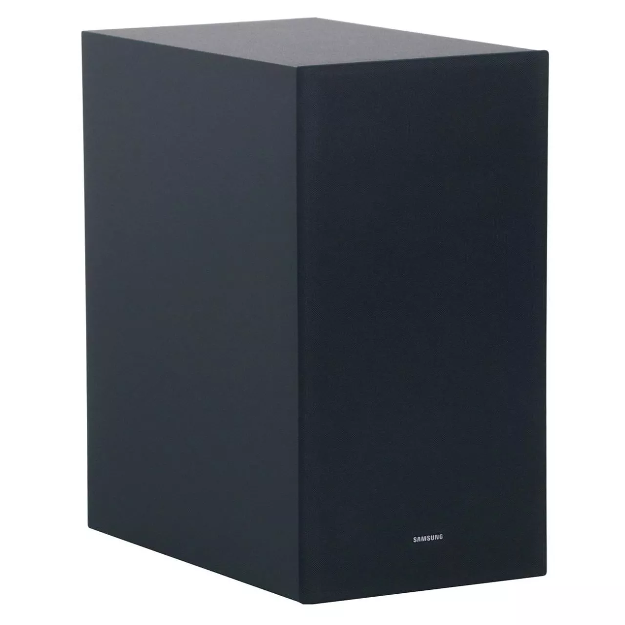 Саундбар Samsung HW-С450 с акустической системой версии 2.1 и общей мощностью 300 Вт обеспечивает получение громкого и объемного звука. К поддерживаемым форматам аудио относятся MP3, AAC, FLAC, WMA, WAV, OGG. Отдельно расположенный сабвуфер активного типа в корпусе из пластика усиливает звучание мелодий и аудиосопровождение видеороликов.