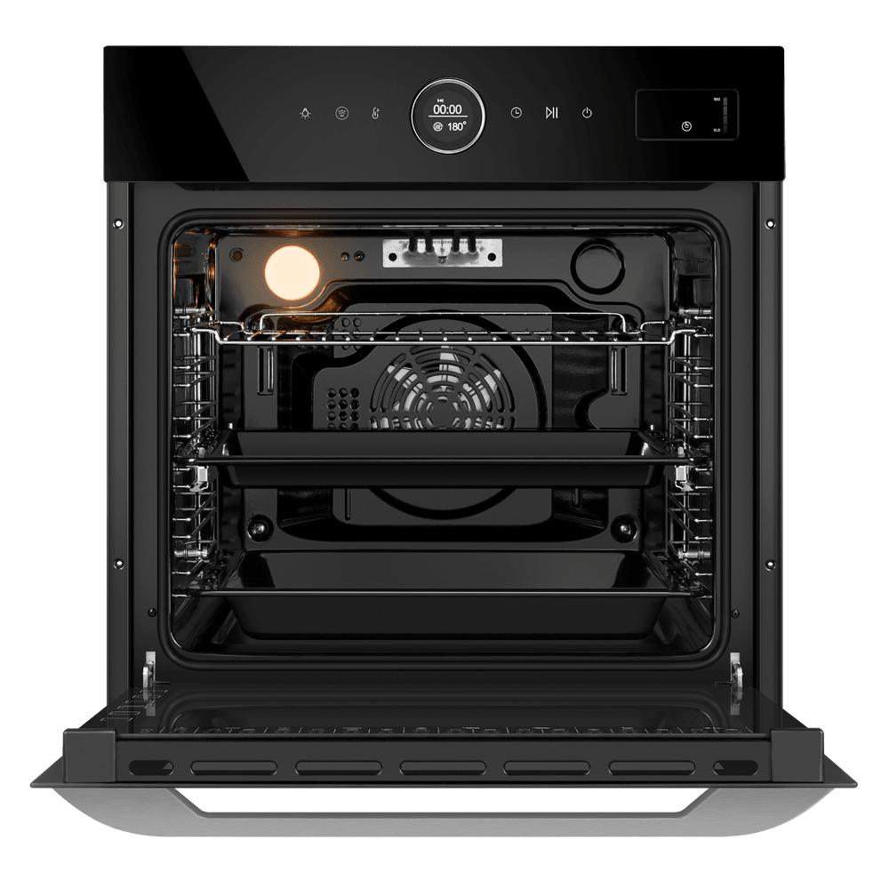 Интуитивное сенсорное управление с дисплеем делает настройку параметров максимально простой: касание — и нужный режим активирован. Тройное стекло дверцы и «холодный фронт» повышают безопасность, снижая нагрев внешнего стекла при работе духовки.