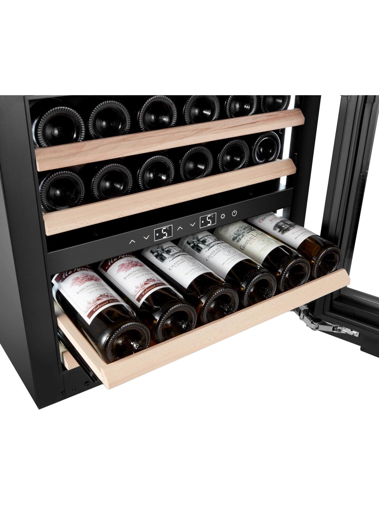 Вместимость до 24 бутылок реализована на полках из натурального бука: телескопические направляющие обеспечивают плавный выезд, мягкая LED-подсветка создаёт атмосферу, а двухзонная конструкция позволяет одновременно хранить белые и красные вина. На модель действует гарантия 2 года.