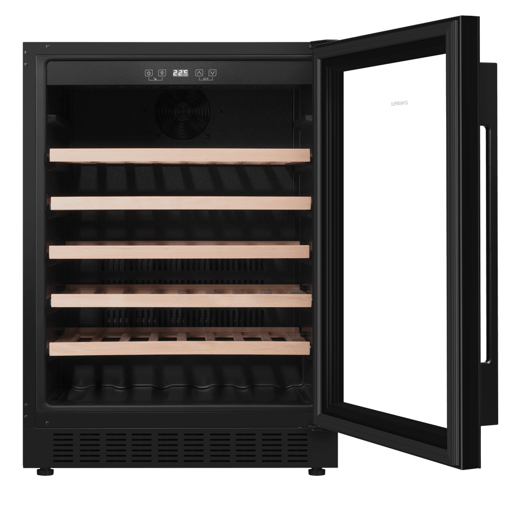 Компрессорная система с вентилятором равномерно распределяет холодный воздух, а дверца из тонированного стекла с УФ-защитой надёжно сохраняет качество вина. Внутренняя LED-подсветка делает коллекцию стильной и заметной.